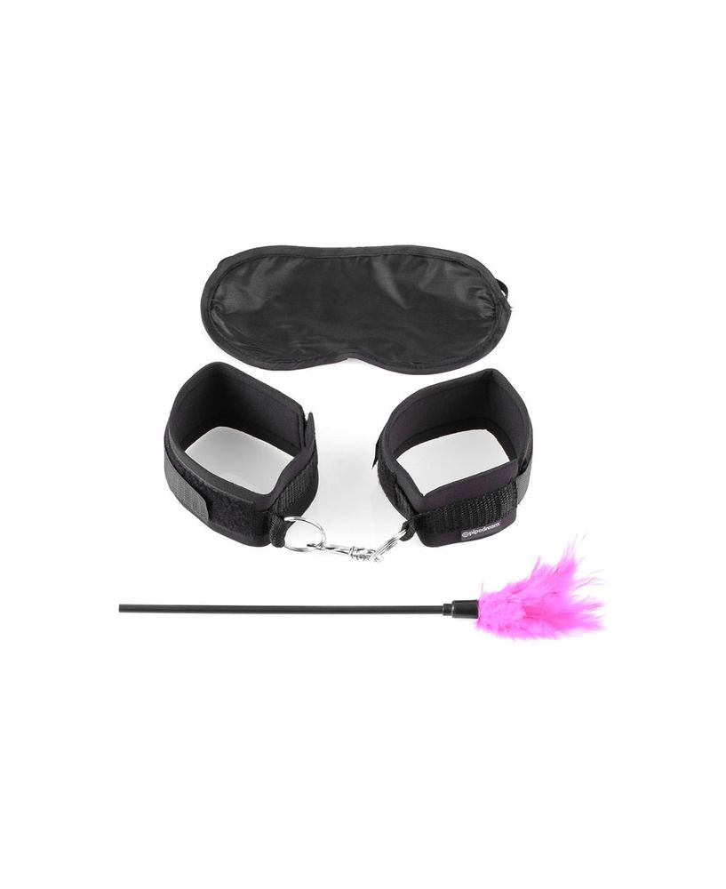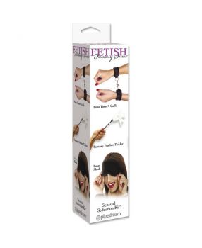 FETISH FANTASY SENSUAL SEDUCTION KIT, es un kit para bondage de la colección FETISH FANTASY SERIES. Explore cada lado oscuro de su pareja con este kit de seducción. El Kit incluye una pluma para masajes, ataduras para muñecas, y una máscara del amor satinada. 100% Ajustable.