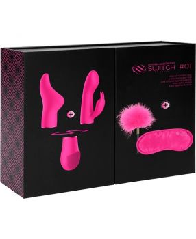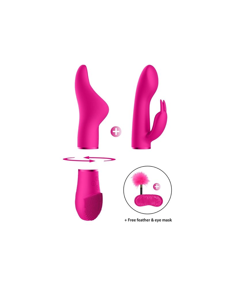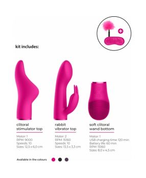 Este cuadro combinado incluye dos accesorios superiores intercambiables para combinar con la base: un estimulador del clítoris y un vibrador de conejo.