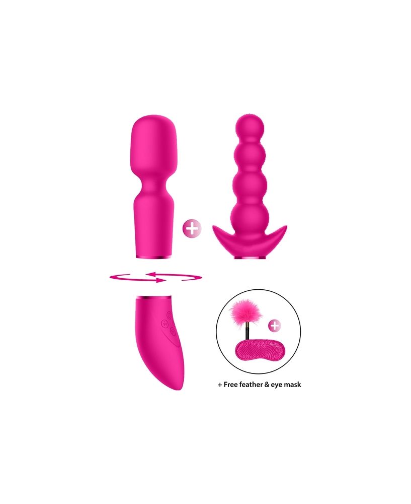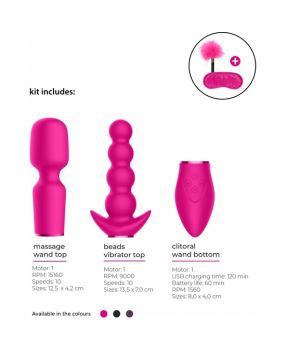 Esta caja trae 2 aditamentos intercambiables: un Vibrador Wand y un Vibrador con Cuentas.