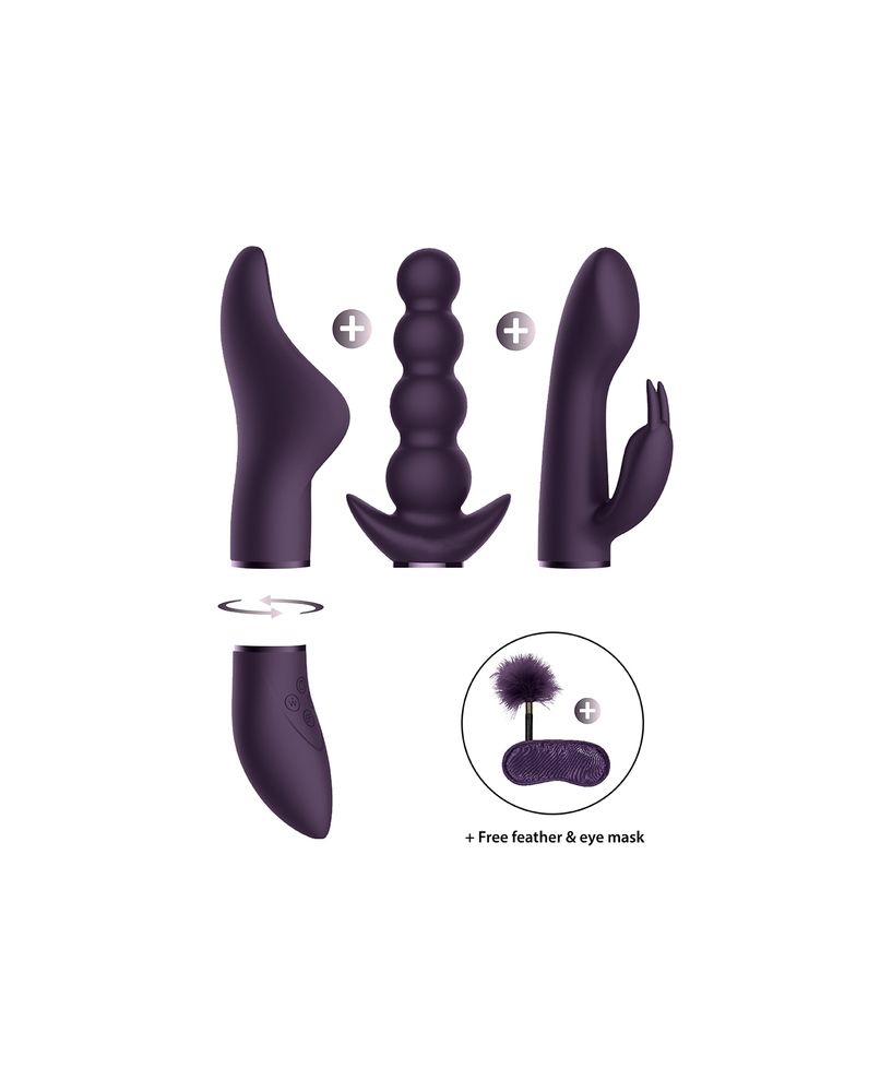 Esta generosa caja presenta tres accesorios intercambiables: un estimulador del clítoris, un vibrador de cuentas y un vibrador de conejo.